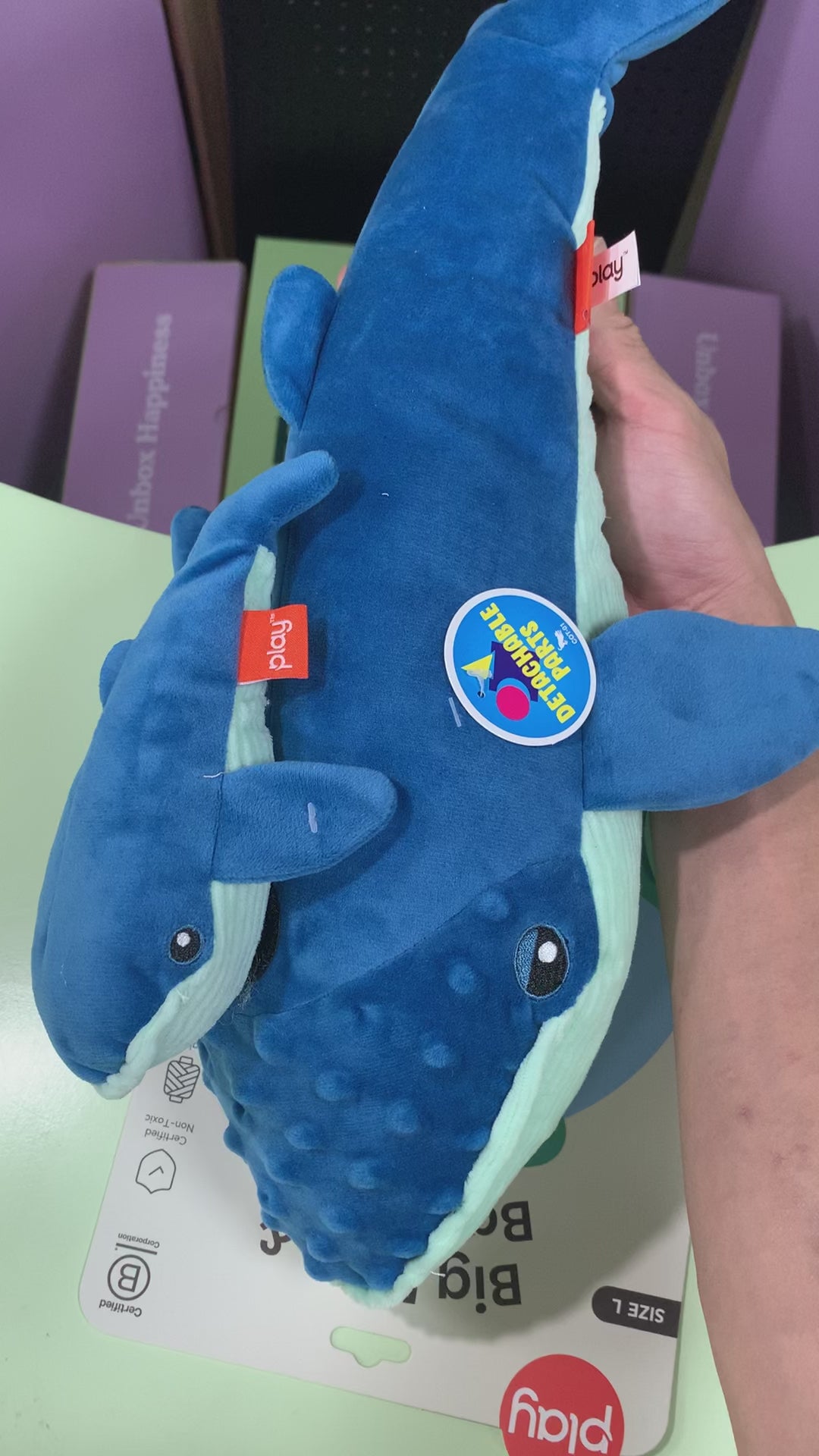 - Mama-and-baby whale duo with squeaks, crinkles and a detachable design