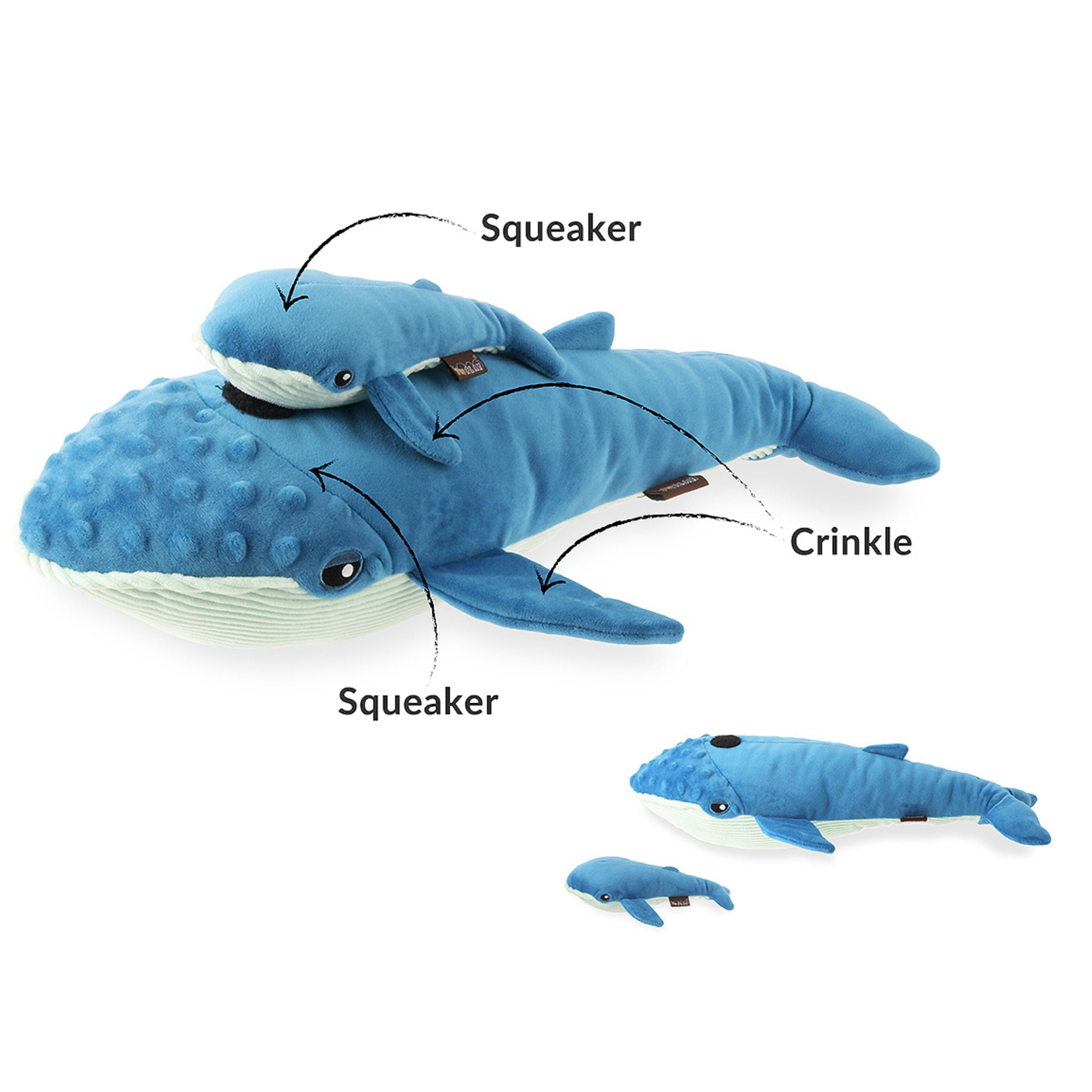 - Mama-and-baby whale duo with squeaks, crinkles and a detachable design