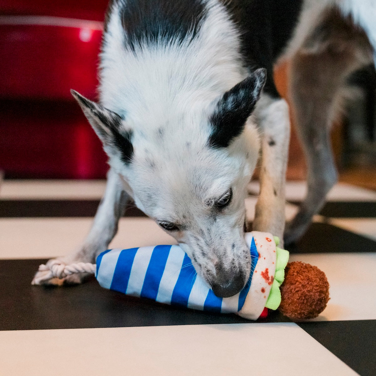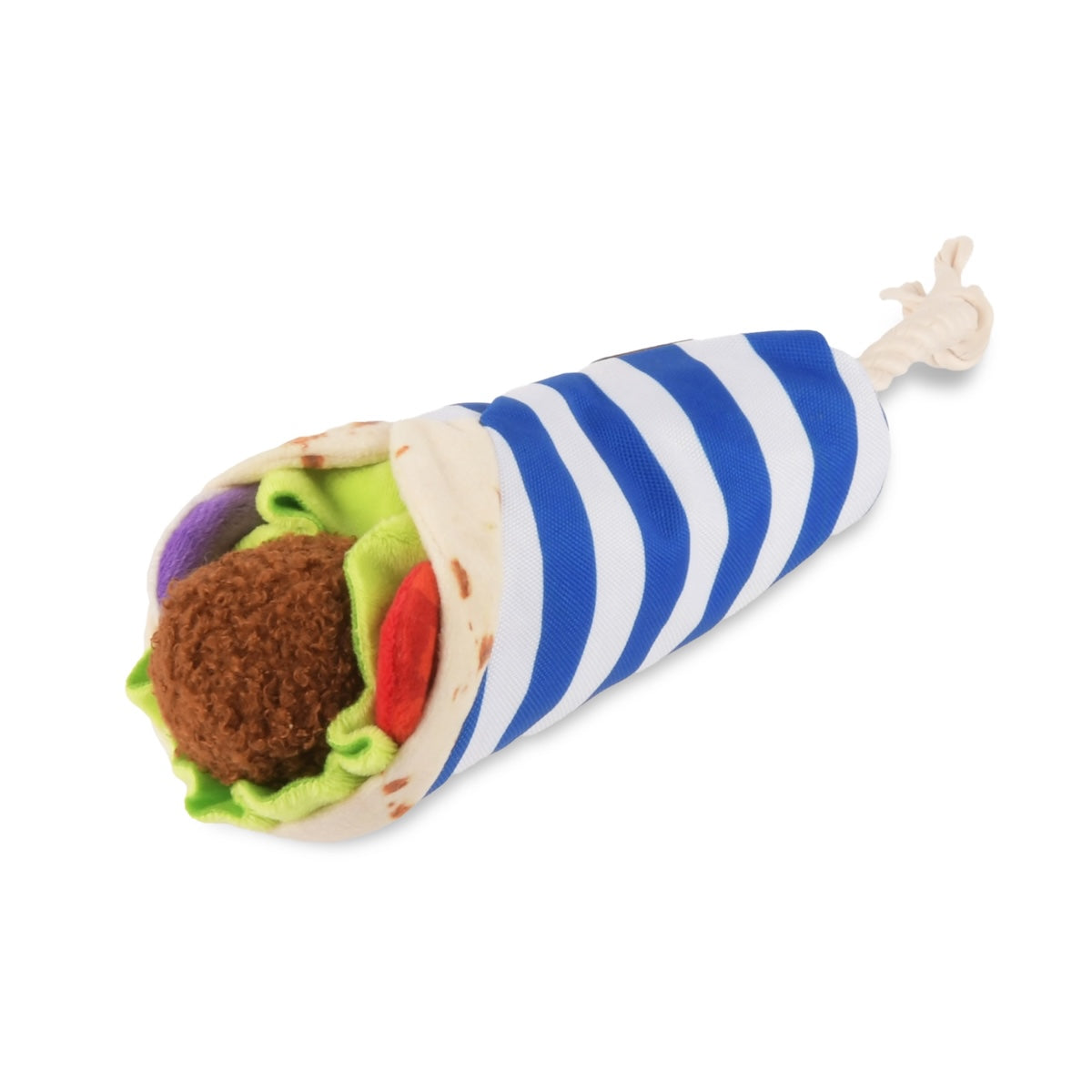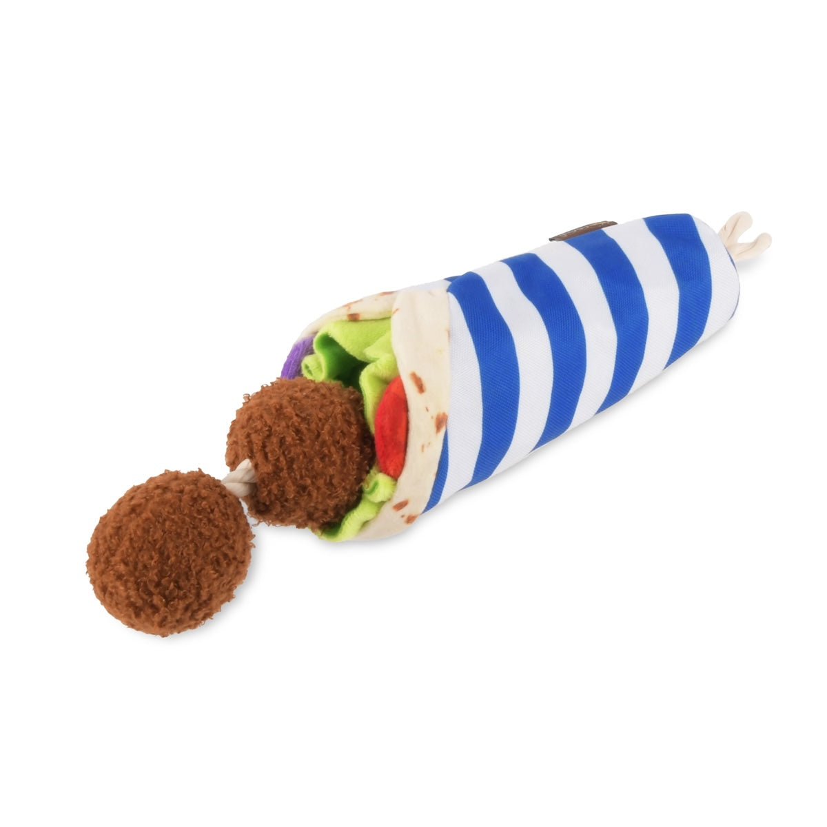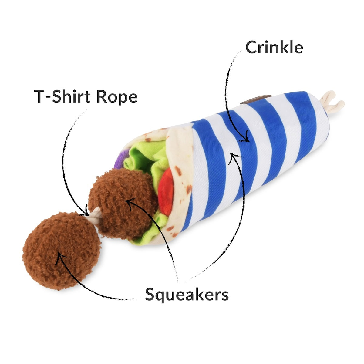 Straight from the food truck to your pup’s toy bin! Inspired by the flavors of the Middle East, P.L.A.Y.’s International Classic Fur-lafel Wrap is stuffed with playtime flavor. With two squeaky meatballs on a sliding rope, crinkly veggie layers and room to stash treats inside, this plush toy delivers endless tugging, twisting and squeaking fun for dogs with a taste for global adventure.